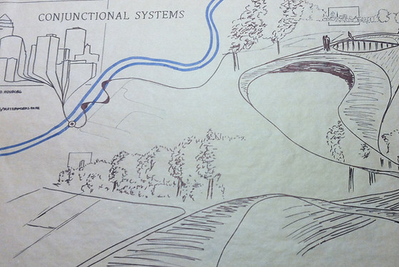 The Design of the 120 foot-tall lookout tower gives an iconic element in the existing Water Works Park. It serves as a platform that draws people from the entrance of the park along the path to conclude with the ultimate experience at the top. This experience is meant to be the "Framing" view of the overall concept of these conjoining systems. Viewers will be able to see the skyline of Des Moines, Raccoon River, and Water Works Park. Seeing these three important systems visually will inspire the important relationship these systems have with each other.